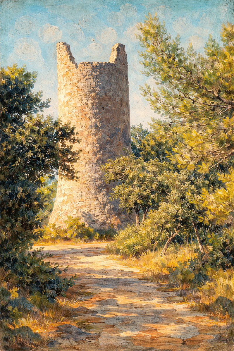 Il sâagit dâune tour cylindrique dâenviron 15 m de haut, Ă©vasĂ©e Ă sa base, construite en pierre.Â
